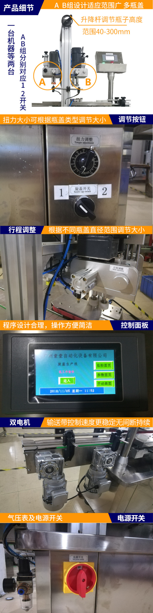 塑料瓶玻璃瓶全自動雙組電機旋蓋機是本公司自主研發的旋蓋機系列,本系列包含全自動理蓋旋蓋機、全自動配線旋蓋機、全自動直線旋蓋機、全自動雙列直線旋蓋機。一機兩用,及一臺機等兩臺,本機采用AB兩組旋蓋設計,覆蓋瓶蓋范圍廣,A組瓶蓋范圍為20-55mm,B組瓶蓋范圍15-30mm,兩組可根據瓶蓋自由轉換,解決了每組范圍內的旋蓋更穩定,效率更高效。采用PLC控制程序,程序設計合理,操作方便簡潔。